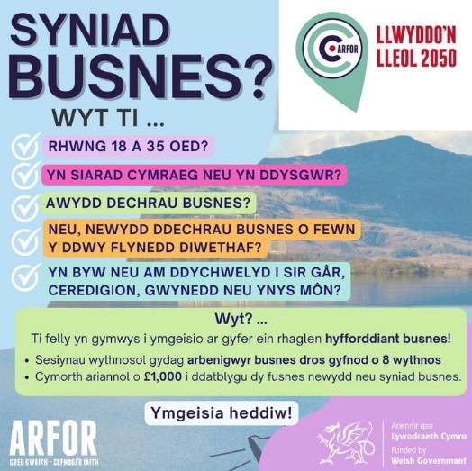 Rhagfyr 2023 – fe wnes weld yr hysbyseb yma ar y cyfryngau cymdeithasol. Cyfle i ymuno ar raglen Hyfforddiant busnes, sesiynau gydag arbenigwyr busnes dros gyfnod o 8 wythnos, tra hefyd yn ennill £1000 am fod ar yr Hyfforddiant!